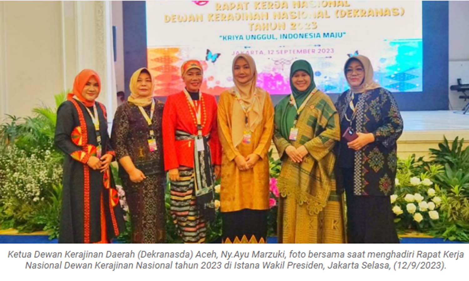Jakarta – Ketua Dewan Kerajinan Daerah (Dekranasda) Aceh, menghadiri Rapat Kerja Nasional Dewan Kerajinan Nasional tahun 2023 di Istana Wakil Presiden, Selasa, 12 September 2023.