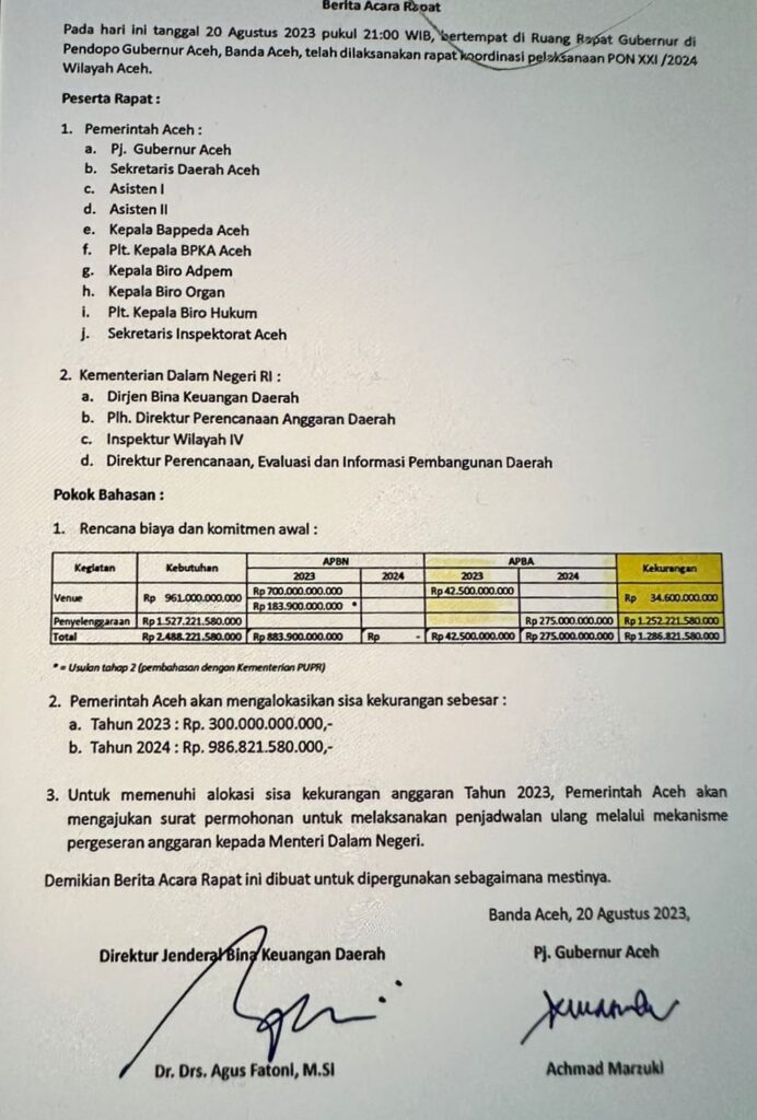 Berita acara rapat pembahasan usulan anggaran PON 2024. Foto Ist